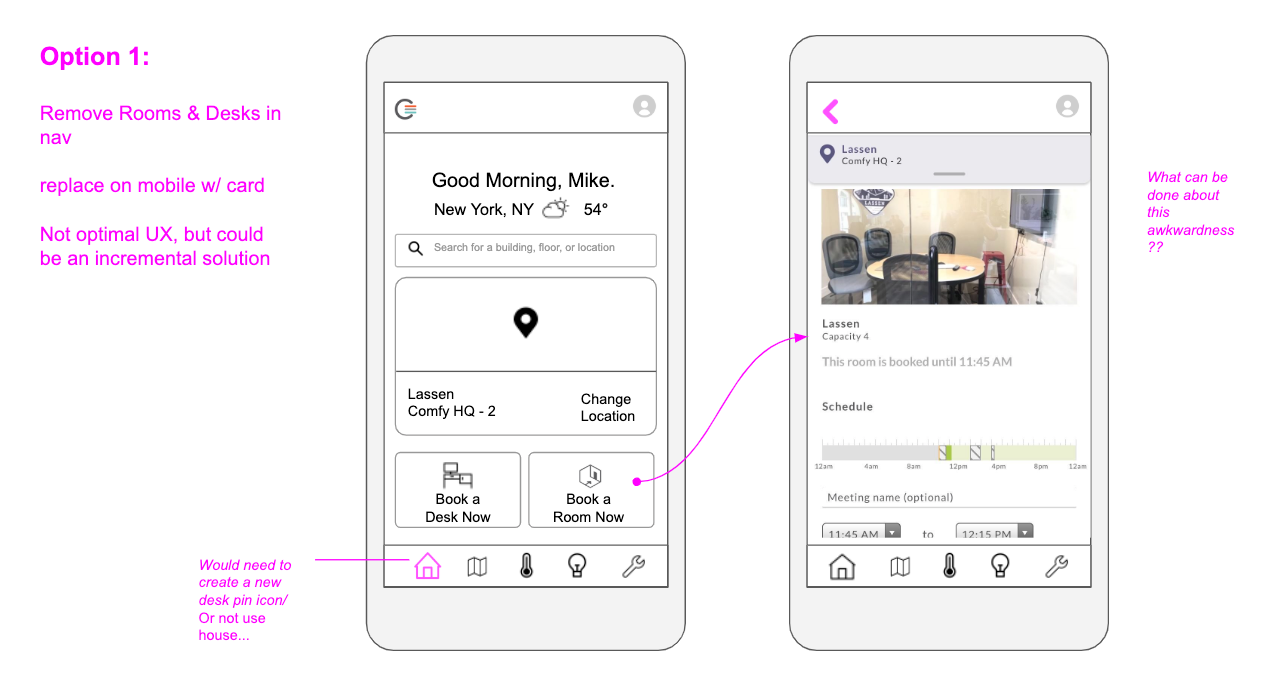As a fast-growing start-up working to be nimble, the design and dev teams simply opted to add these new features as individual pages in a bottom nav. The user landed on the floor map when opening the app.