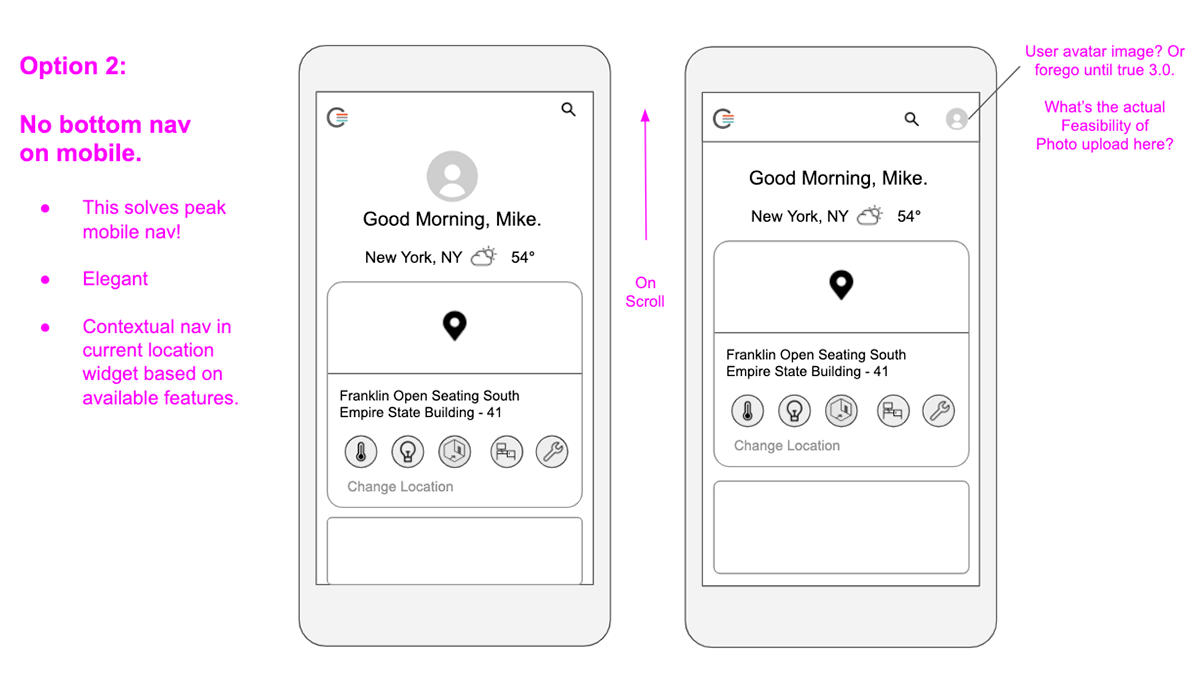• Can we feasibly remove the nav, build the cards and support side-scrolling elements on top of them in the first phase of development or do we need to design for multiple phases?