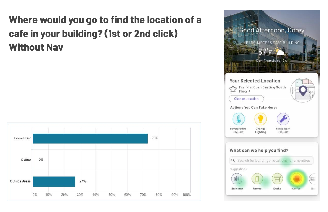 The heat map imagery showed us that users were able to successfully complete all tasks with wither nav structure. There was an overwhelming preference from our executive team to strive for the no nav version to de-clutter and elevate the style of the product. Since user testing showed no problems with that, we moved forward.