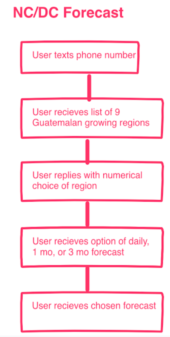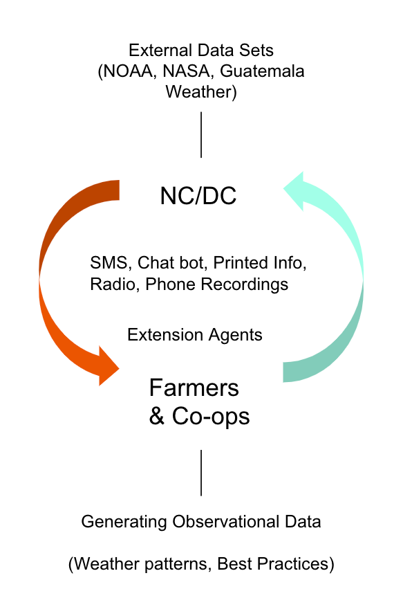 Another factor that added to the unique challenge of this hackathon was the limited access to technology of the target audience of Guatemalan farmers: namely, shared desktops at co-ops and cellular phones restricted to SMS communications. This really pushed our team to dig for low-tech solutions to a massive problem.